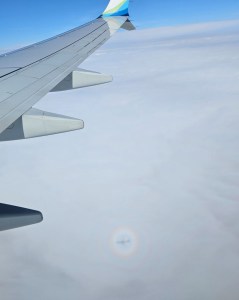 We both had mixed emotions about returning to AK. But something really cool happened to both of us while we were heading on the last leg of our trip there. MT arrived an hour later, which means we weren’t on the same flight. But we both saw this rainbow below our different aircraft’s with the shadow of the aircraft inside the rainbow.